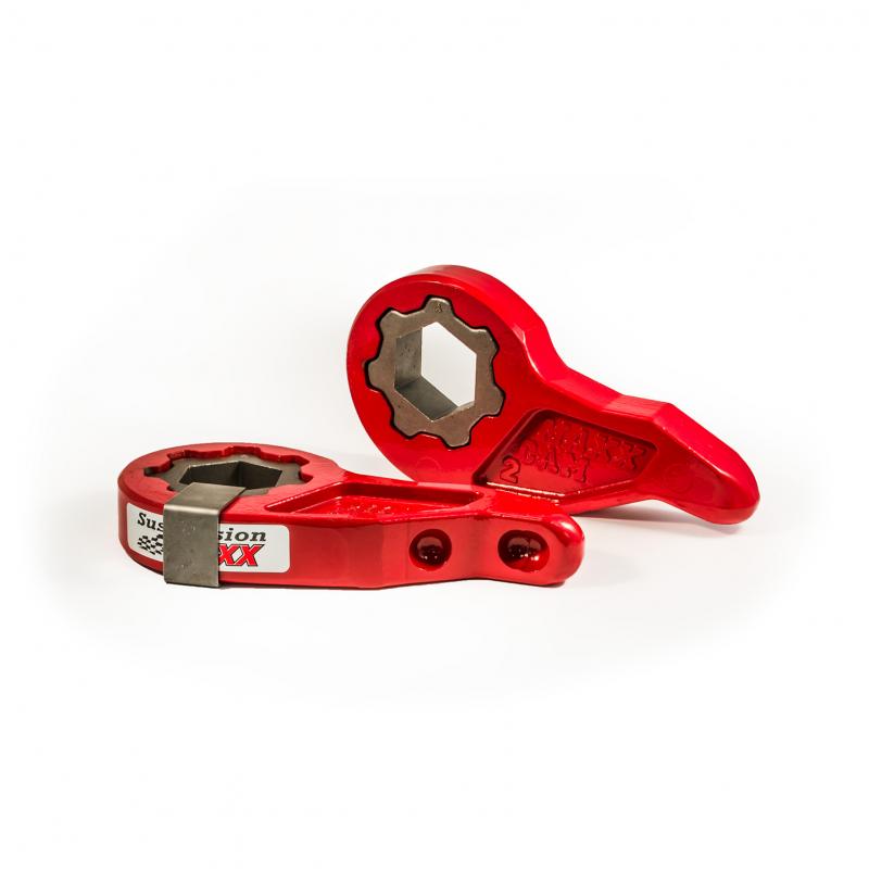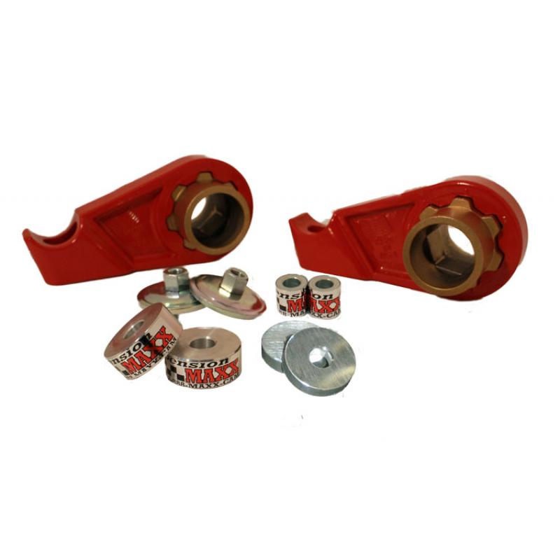 SuspensionMAXX Leveling Kits are the perfect choice for lifting, leveling or dropping the front suspension on torsion bar equipped trucks and SUV’s. Our leveling kits increases vehicle function while providing your truck with a more aggressive look. Patented hex calibrated fixed forged torsion bar keys feature an internal gear adjustment mechanism that provides up to 7 incremental height adjustments. Our leveling kits can be calibrated to any amount of corrected height and degree torsion bars require with controlled preload and no degradation in handling or ride quality.