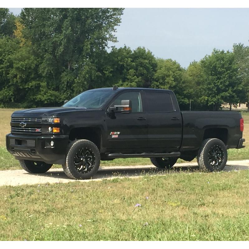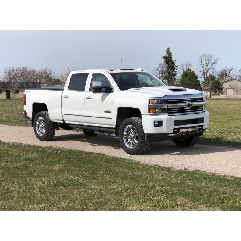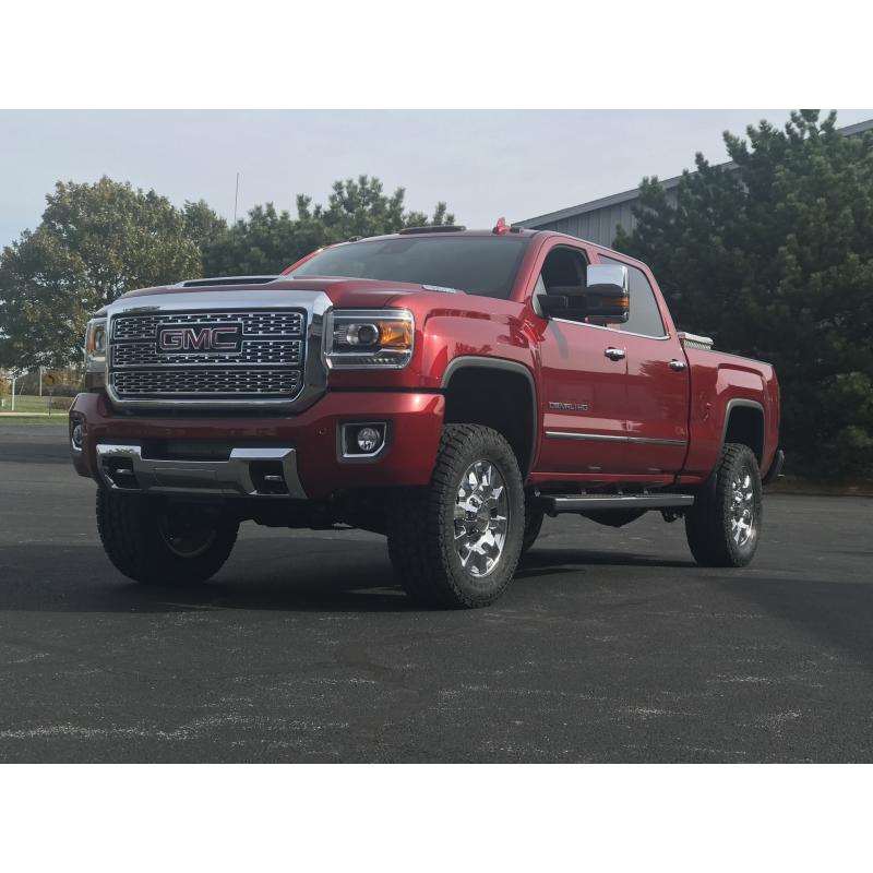 Includes patented SuspensionMAXX MAXX Cam 3 leveling kit and our MAXX travel upper control arms . Plus 5100 Bilstein shocks. Allowing for up to 3" of lift and tires sizes up to 35" ALL TERRAIN TIRES on 2015-2019 GM HD trucks. 34" tires on 2011-2014 GM HD trucks. Note: Must use the factory or 9" wheel with positive offset for best clearance.