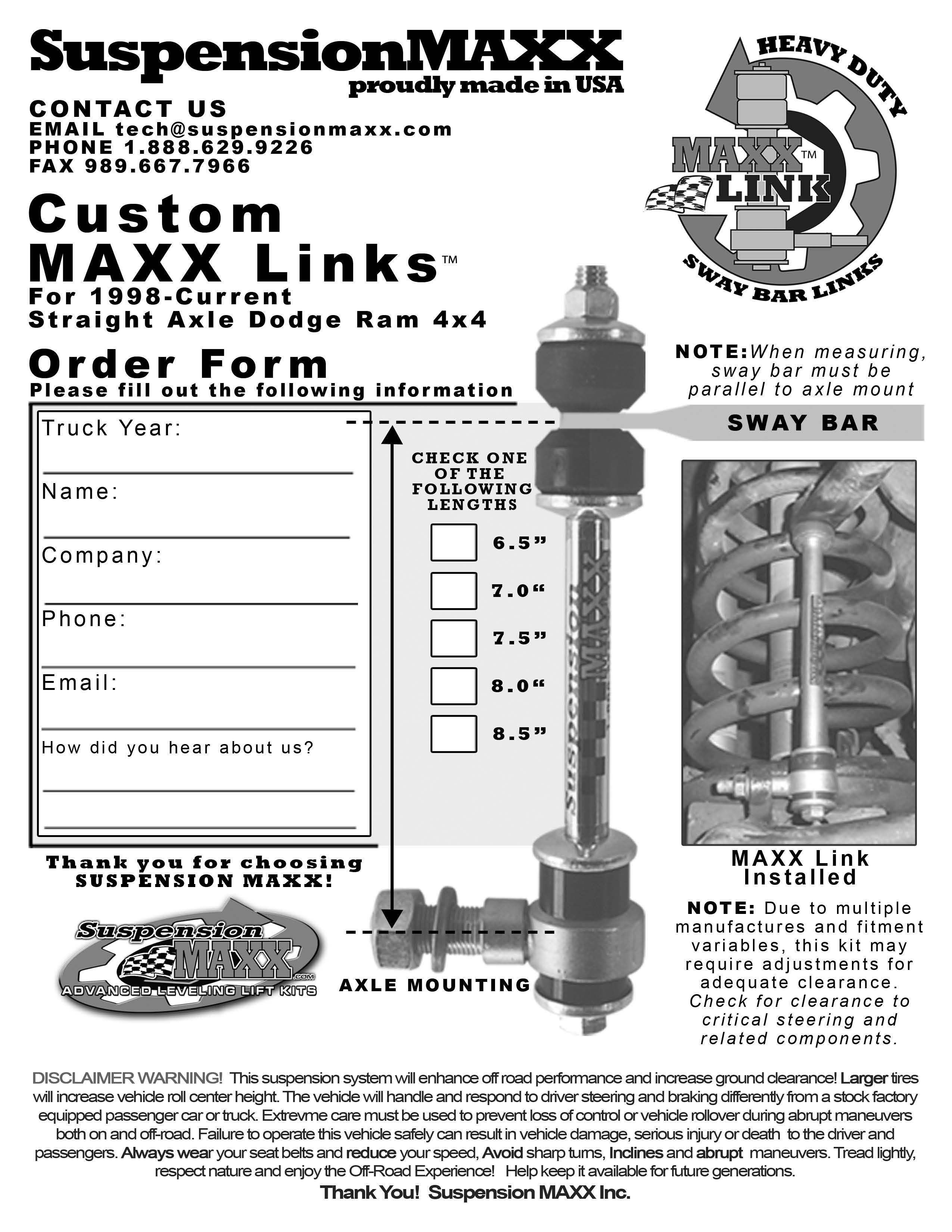 If you wish to return your SuspensionMAXX product please contact us by phone or email. Fill out the Return Form Bellow and mail it back with your return. You must notify us within 90 days of receiving your shipment. Non-warranty returns are subject to a 15% restocking fee, and all shipping charges are nonrefundable. Items must be in new condition (No Exceptions), any cosmetic wear or damage from improper packaging in return shipping will increase the restocking fee to 25%. You are responsible for the return shipping cost and insurance fee (if desired). Our staff will inspect returned products, and issue credit promptly. No returns after 90 days from date of delivery. If you have ordered the wrong item by mistake, we do offer exchanges at no additional charge within 90 days.