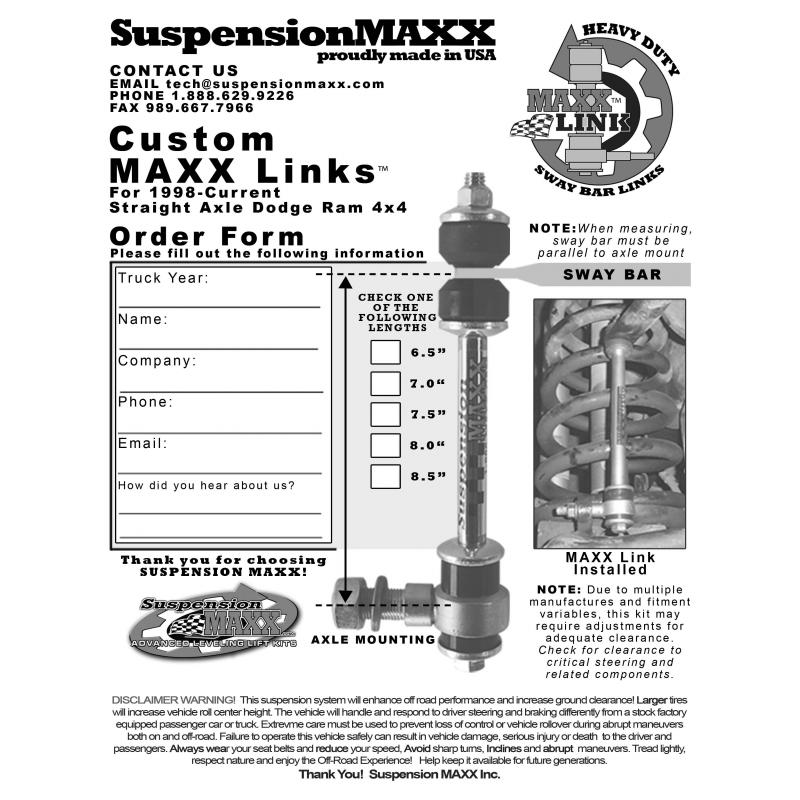 MAXXLinks simply replace original equipment sway bar end links. Installation takes just forty five minutes to an hour and is supported by the SuspensionMAXX Technical Support Program.